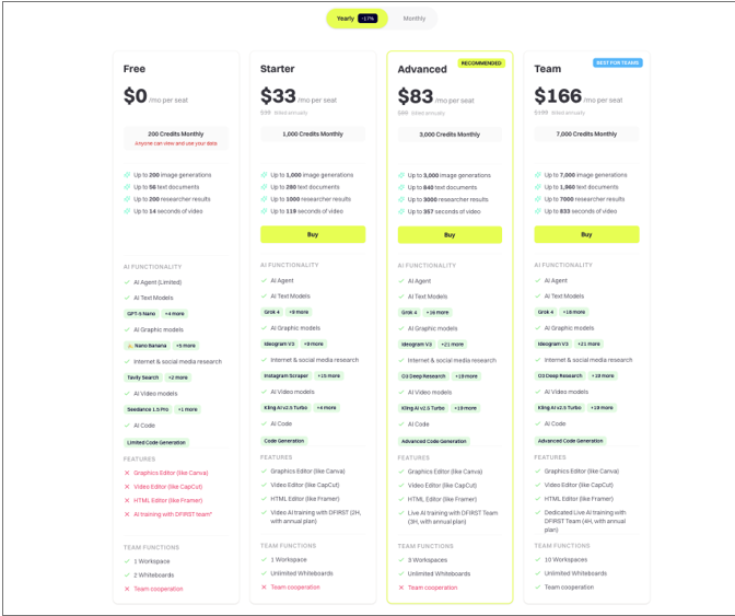From the product page, Dfirst has monthly plans. The starter is $33 per month. It gives basic tools and limited exports. The Advanced plan costs $83  monthly. Includes full AI suite and team collaboration. Team plan is $166 per month. Offers unlimited workspaces and API. Billed yearly for discounts. Prices may change. Visit site for updates.