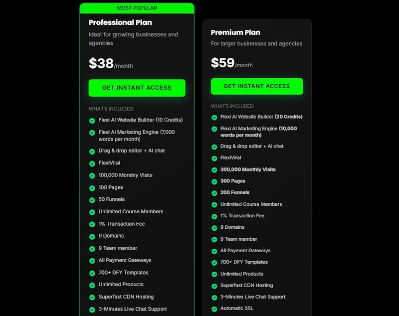 FlexiFunnels offers a streamlined pricing structure designed to replace expensive tech stacks. The “Most Popular” Professional Plan costs $38/month, providing 10 AI website builder credits, 100,000 monthly visits, and 50 funnels. For larger scaling needs, the Premium Plan is $59/month, doubling your AI credits to 20 and increasing capacity to 300,000 visits and 200 funnels. Both tiers include unlimited course members, 9 domains, and built-in hosting, making it an affordable all-in-one solution for business owners.