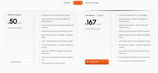 BrandJet offers two annual plans with a 20% discount. The Starter Annual plan costs $50/month ($600/year) and provides unlimited email campaigns, multi-platform social outreach, 1,000 monthly leads, and tracking for 10,000 brand mentions. It also includes AI sentiment analysis and AI model monitoring. The Pro Annual plan, priced at $167/month ($2,000/year), upgrades capacity to 10,000 monthly leads and 50,000 tracked mentions. It adds full multi-channel competitor tracking and priority live support for scaling businesses.