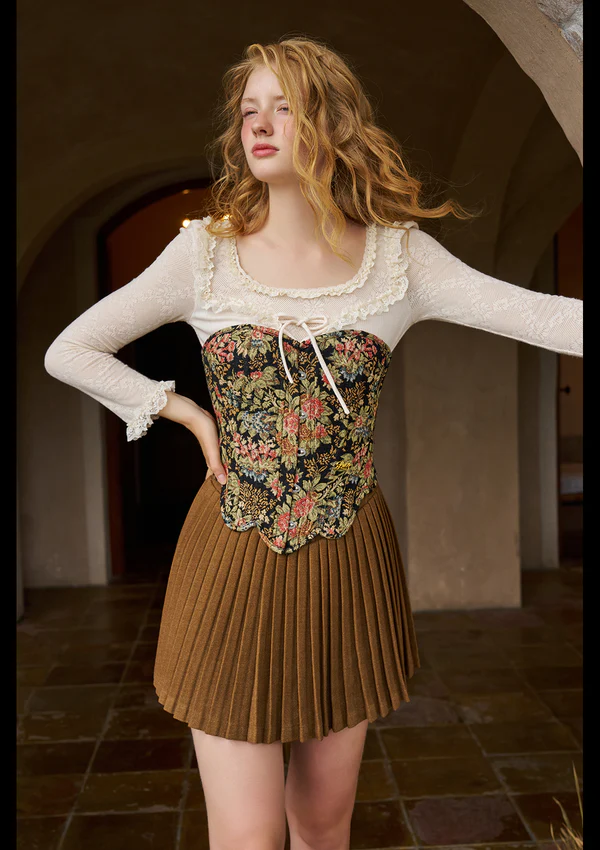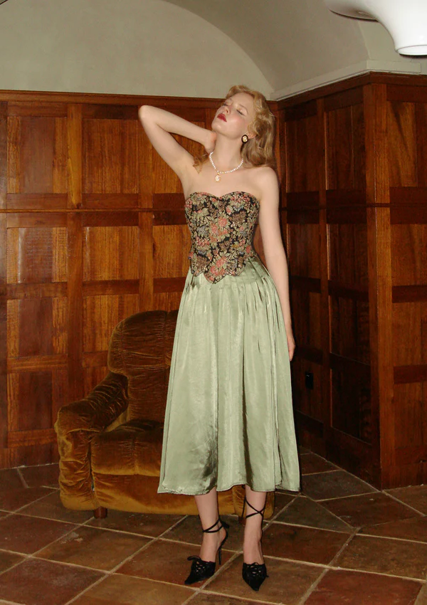 The Mamian skirt’s structured pleats and flat high waist create the perfect backdrop for a corset. Both pieces emphasize structure and curves, and are often crafted from intricate jacquard or embroidered fabrics, making them highly harmonious in terms of craftsmanship and aesthetic.